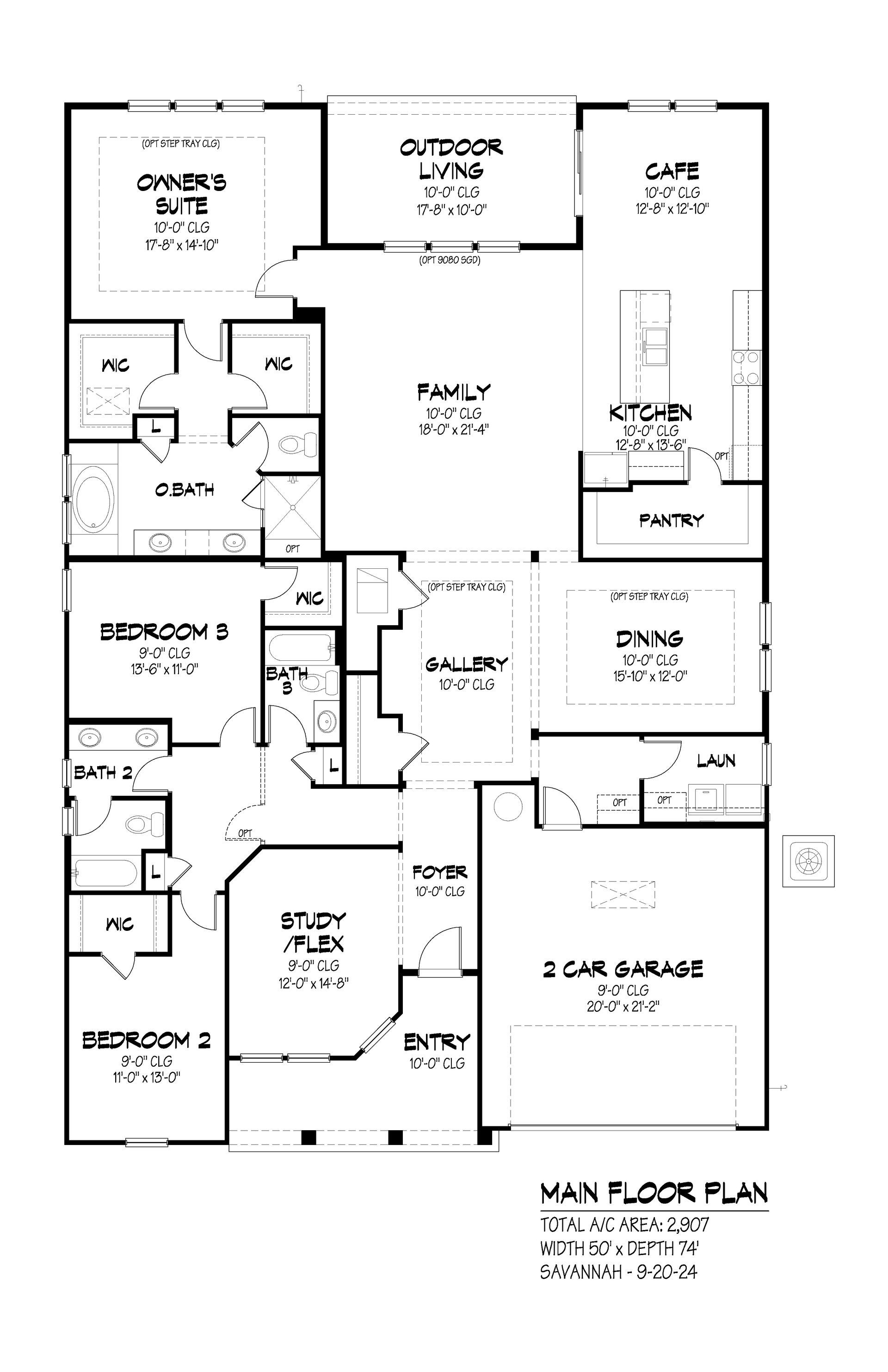 The Savannah floor plan offers an open-concept design, perfect for modern living. The spacious café and center island seating create a welcoming gathering space, while the kitchen boasts ample cabinet storage, a Chef’s pantry, and an optional butler’s pantry for added convenience. The owner’s suite is thoughtfully tucked away from the main living area, providing a private retreat with a walk-in shower and double vanities. A versatile flex room can serve as a home office, playroom, or be converted into an optional fourth bedroom. This plan also features an optional bonus room and den, offering even more flexibility to fit your lifestyle. The family room seamlessly connects to a covered lanai, enhancing indoor-outdoor living with added backyard privacy.